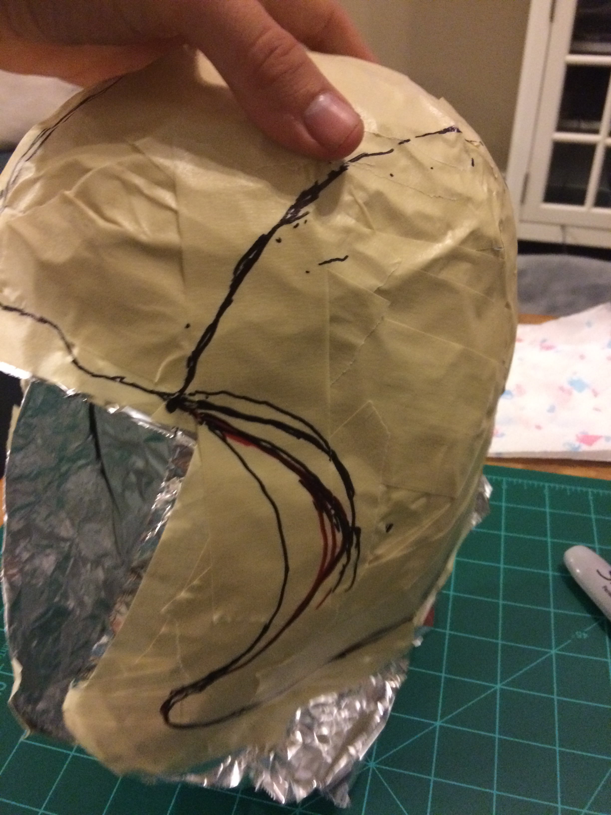 We began by wrapping someone’s head with foil followed by masking tape. The tape helps reinforce the structure of the mock up.  After drawing the helmet shape we wanted on the masking tape, we cut it off. It looked like this: