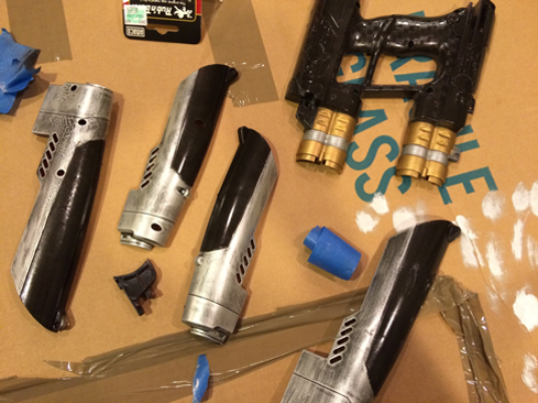 After applying the wood filler and sanding the appropriate parts smooth, I spray painted the blasters flat black.