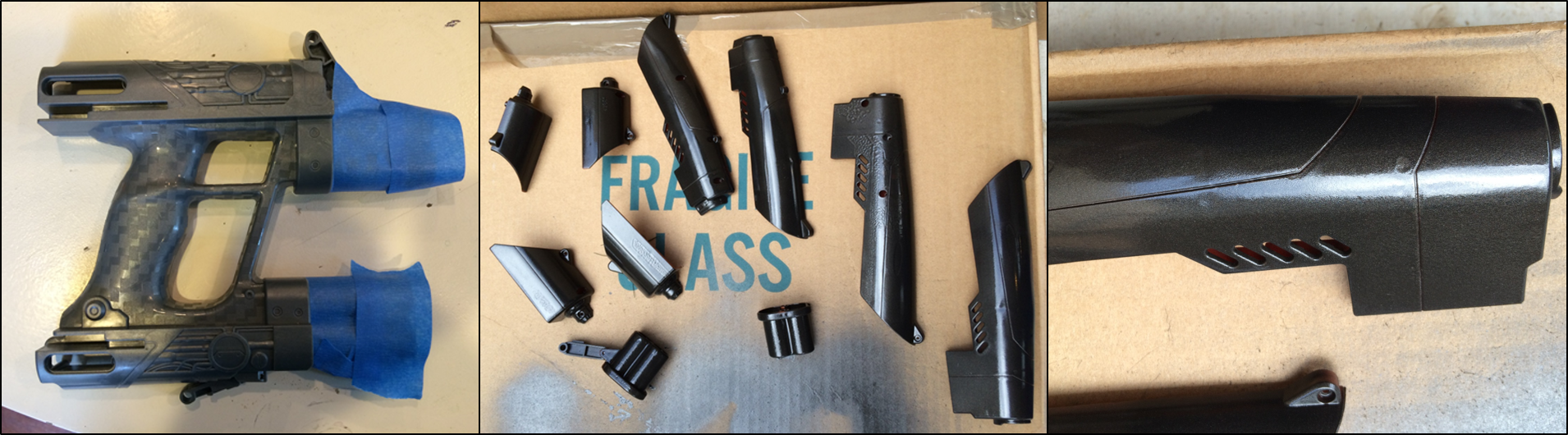 After breaking down the gun, I sanded off the Nerf logo and other plastic text. I then sanded off the silver paint and the finish on the shiny plastic to help the paint adhere to the gun. For a base coat, I decided to use a metallic, “carbon mist” black primer & paint. I thought the shine would give it a little more pop.