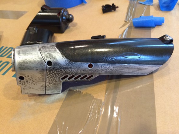 I then applied silver to the middle portion.  I put a black wash over this part to bring out the details and make it look dirty. Now, I’m waiting for the paint to dry before applying a protective coat and reassembling the blaster. So, this is where I currently stand: